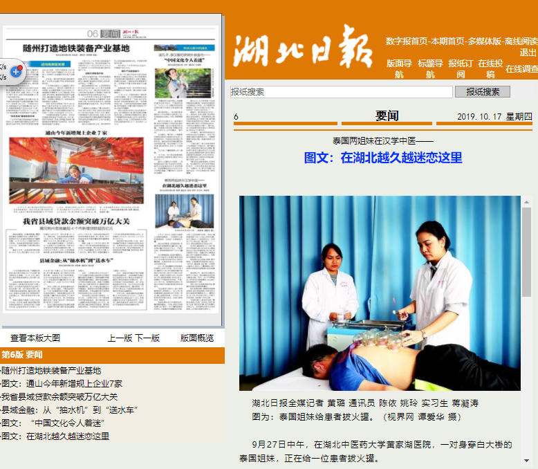 9月27日中午,在湖北中医药大学黄家湖医院,一对身穿白大褂的泰国姐妹,正在给一位患者拔火罐。